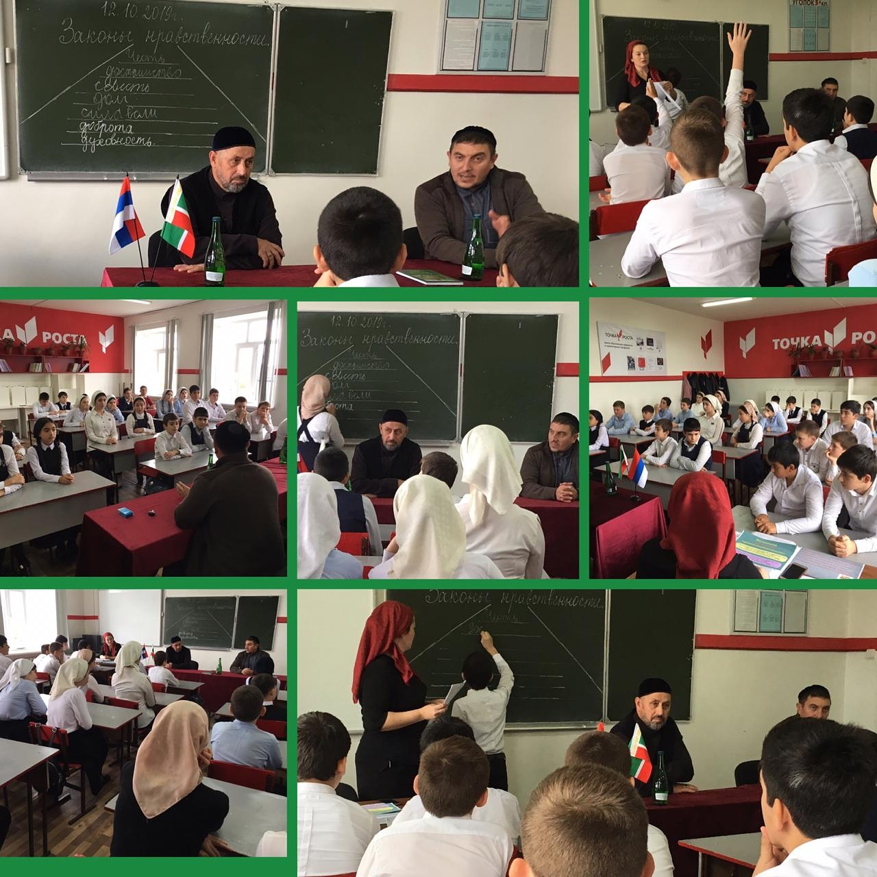12.10.2019г. в гимназии состоялась встреча обучающихся 6-8 классов с имамом мечети с.п.Знаменское Берсаевым К.С. и представителем кадарийского тариката Ахьядовым И.М. на тему нравственного воспитания. Открывая встречу, зам.директора по ВР Мальцагова М.С. вкратце рассказала о работе, которая проводится в гимназии в рамках Единой Концепции по духовно-нравственному воспитанию подрастающего поколения, отметила важность подобных встреч с ребятами, особенно, когда у них переходный возраст. Гости побеседовали с ребятами о нормах и правилах поведения и отношения друг к другу, окружающим людям, также о чрезмерном увлечении интернетом. В ходе обсуждения гимназисты ответили на вопросы, что такое нравственность, каково ее "золотое правило" и как его применить, записали на доске нравственные качества. Имам мечети, рассказывая о духовных ценностях, о нравственном воспитании молодого поколения приводил хадисы, притчи из Корана, поучительные истории из жизни. "Родители и учителя вас направят в правильное русло. В жизни важно не ошибиться и не сойти с правильного пути. Нужно научиться поступать не так, как хочется, а так, как надо", - отметил он.