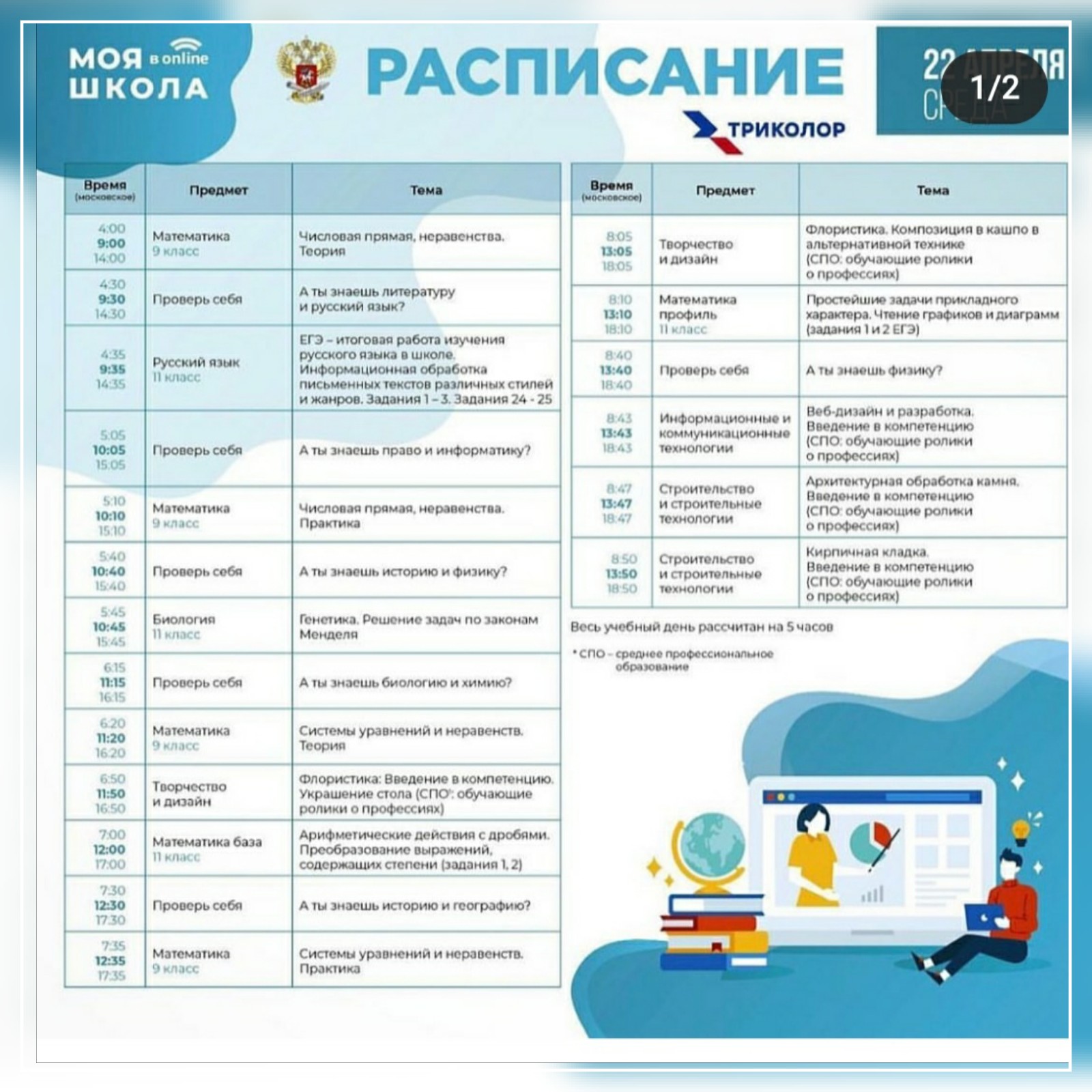 20.04.2020Публикуем расписание первого дня трансляции нового телевизионного образовательного проекта Минпросвещения России «МОЯ ШКОЛА в online»