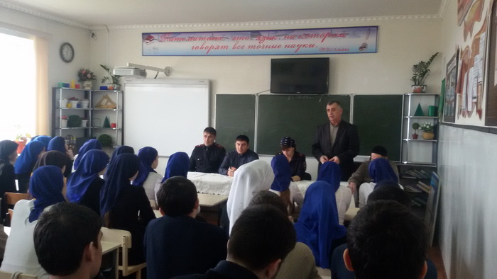 13.02.2015В гимназии №10 прошла встреча обучающихся с представителя духовенства и представителей РОВД. Была проведена беседа на тему: «Среди нас нет места ваххабизму и терроризму», «Терроризм – угроза жизни». В беседе участвовали имам с.п. Знаменское Берсаев К.С., инспектор ПНД Хасуева М.А. и участковый полиции Юсупов А.Н..