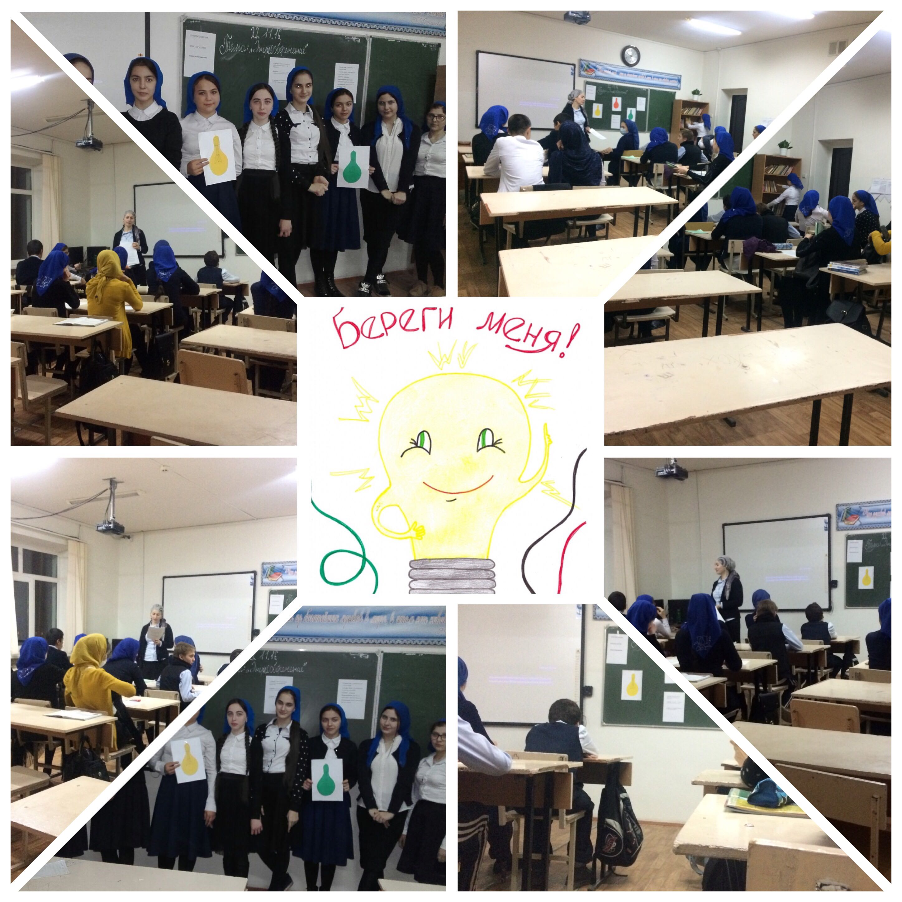 Ребятам было рассказано о том, как можно сэкономить энергоресурсы в гимназии и дома, какую роль играет энергосбережение в сохранении экологии Земли и какие правила необходимо соблюдать каждому, чтобы беречь природные ресурсы. В конце занятий дети получили задание, дома рассказать родителям об энергосбережении и совместно составить Памятки с рекомендациями по энергосбережению. Классный руководитель 8-А класса Амаева З.Н. в своем классе по данной теме провела анкетирование. Ребятам классный час был интересен, они выступали, делали обобщение, приводили примеры.В завершении мероприятия ребята сделали вывод: нужно беречь энергию и расходовать её более разумно. Учителя начальных классов рассказали ребятам, чем опасно электричество и почему необходимо с повышенным вниманием относиться к таким привычным в нашей современной жизни объектам, как электрические столбы и трансформаторные будки. Также на уроках окружающего мира было объяснено, как правильно обращаться с бытовыми электроприборами и к каким печальным последствиям может привести нарушение элементарных правил электробезопасности в быту.