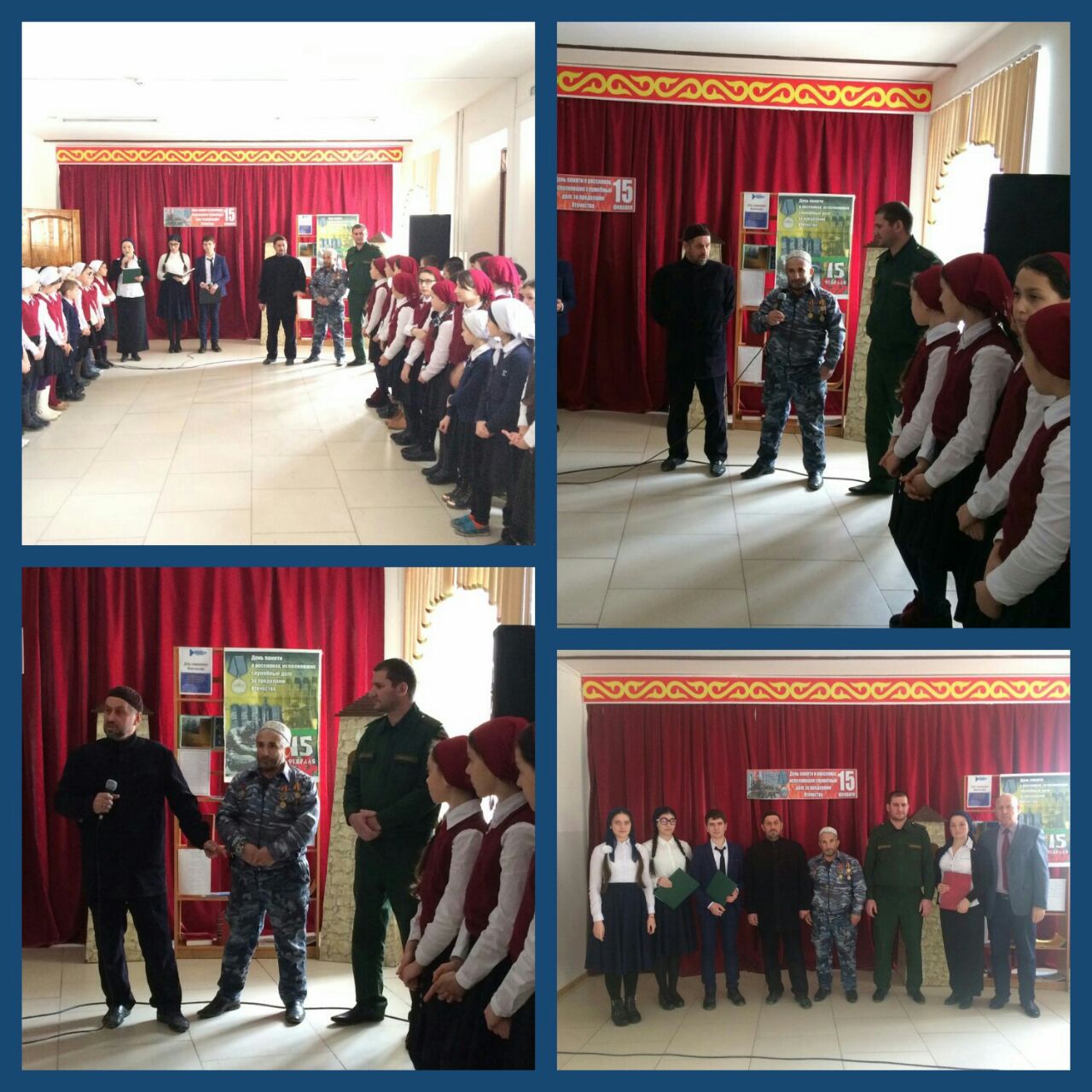 На мероприятии присутствовали помощник начальника отделения учета мобилизационных ресурсов Хамидов Магомед Султанович, воин-афганец Давутмурзаев Асланбек Исаевич «Сегодняшняя встреча посвящена памятной дате в истории нашей страны – Дню воинов интернационалистов, - отметила на открытии линейки зам. директора по ВР Мальцагова М.С.