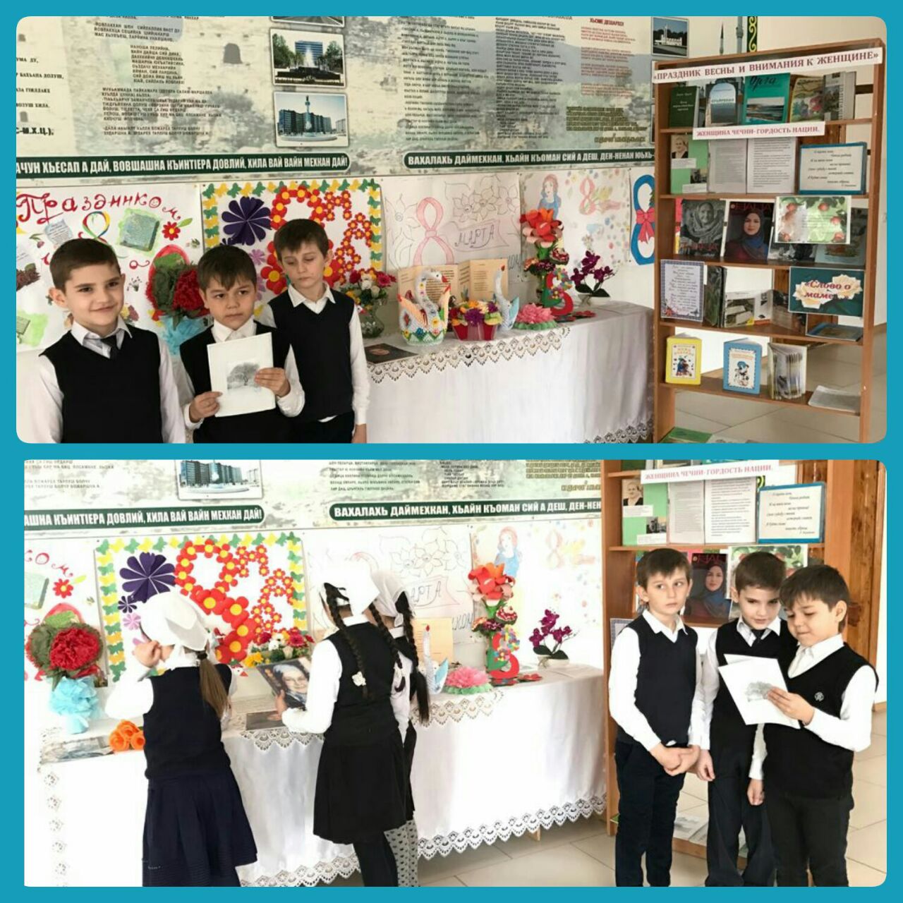 Детские рисунки, подарки для любимых мам и бабушек, сделанные своими руками, создают праздничное настроение. Яркое впечатление о празднике 8 Марта оставила тематическая выставка «Праздник весны и внимания к женщине», организованная зав.библиотекой Хаджиевым М.Ш. Судя по названию нетрудно догадаться, какие книги на ней представлены. Также на выставке можно было найти интересные выборки из журналов «Нана», «Орга», «Стела1ад». Представленные материалы рассказывают об истории этого праздника, о знаменитых женщинах, об их образе в художественной литературе. Главное место занимают материалы о женщине-матери, об уважении и любви к ней. Здесь можно найти стихотворения и детские песни, посвященные матерям, бабушкам. Выставку украшали оригинальные поделки, сделанные руками наших постоянных читателей. Своим мероприятием Магомед Шемханович постарался подобрать ключик к детским душам, чтобы они с пониманием и уважением относились не только к маме, но и ко всем женщинам. Подобные выставки вызывают живой интерес у ребят, они с удовольствием берут книги для прочтения дома.
