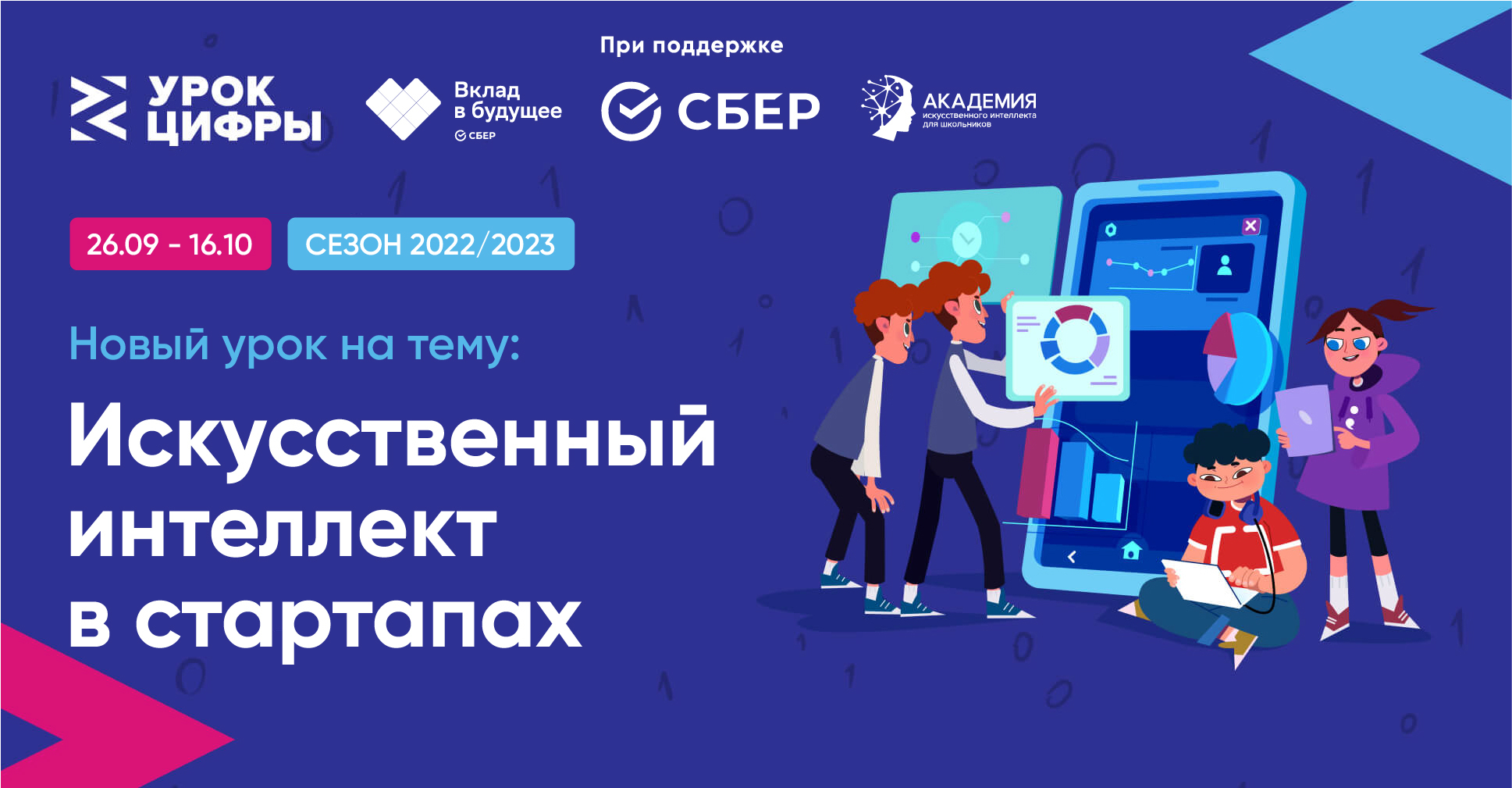 23.09.2022Минцифры России совместно с Минпросвещения России, АНО «Цифровая экономика», а также Благотворительным фондом «Вклад в будущее» при экспертной поддержке Сбера, в партнерстве с ключевыми российскими компаниями сферы информационных технологий проводит мероприятие по теме «Искусственный интеллект в стартапах» (далее – Урок) в рамках всероссийского образовательного проекта «Урок цифры» (далее – Проект).Урок адресован учащимся 1–11 классов и направлен на развитие ключевых компетенций цифровой экономики у школьников, а также их раннюю профориентацию в сфере информационных технологий.