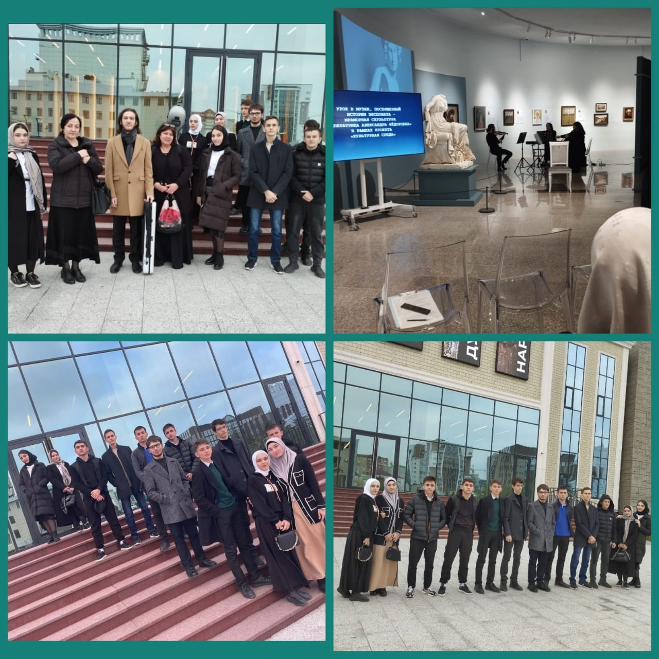 9 ноября классный руководитель 11 класса Мамакаева Ф.А. организовала для своих учащихся экскурсию в г.Грозный. Они посетили «Урок в музее», который проводится в рамках проекта «Культурная среда». Одиннадцатиклассники воспользовались государственной программой «Пушкинская карта». Проект «Культурная среда» направлен на привлечение детей и молодёжи в культурную жизнь республики и развитие сферы культуры и искусства. Урок был посвящен истории мраморной скульптуры «Императрица Александра Федоровна». Уникальную атмосферу представлению добавило музыкальное сопровождение Государственного симфонического оркестра Чеченской Республики. Нужно отметить, что инициатором и идейным вдохновителем мероприятия является министр культуры Чеченской Республики А.Р. Кадырова. Ребята узнали, что скульптура императрицы была создана немецким скульптором Людвигом Вихманом по прототипу работы его старшего брата Карла Вихмана (автора первой скульптуры Императрицы) и предназначалась в подарок Николаю I от Фридриха Вильгельма IV. О судьбе скульптуры рассказала актриса в образе Императрицы Александры Федоровны. Проверить, насколько хорошо они усвоили данный материал, помогла увлекательная викторина, по итогам которой наши ребята получили билеты на очередной «Урок в музее». Мероприятие очень понравилось ребятам, оно помогло им не только хорошо провести время вместе, но и освежить знания об истории культуры и архитектуры.