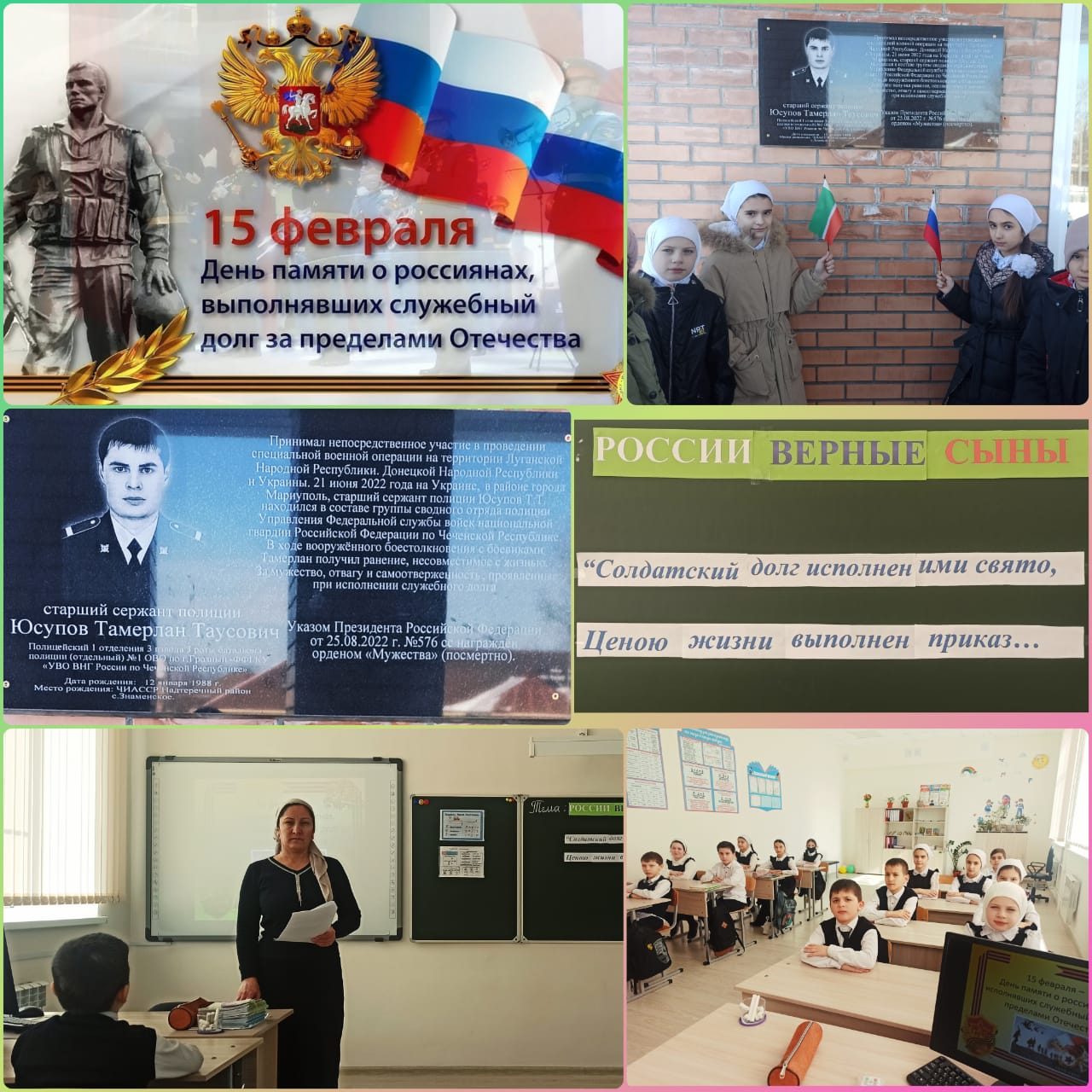 В 4в классе (кл.руководитель Хажмурзаева З.Х.) прошел кл. час, посвященный «Дню памяти о россиянах, исполнявших служебный долг за пределами Отечества».Мероприятие завершилось минутой молчания в память о всех погибших воинах, отдавших свои жизни в горячих точках.