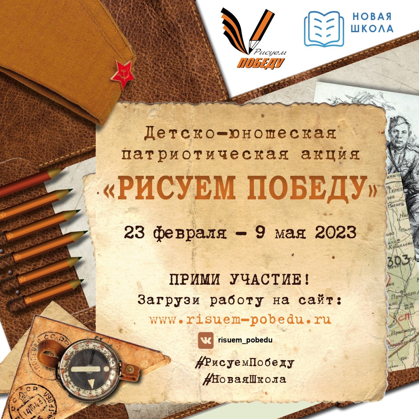 Рисуем и помним нашу Победу!Во всех регионах Российской Федерации и странах СНГ стартовал новый сезон патриотической акции «Рисуем Победу», реализуемой ежегодно в рамках федерального партийного проекта «Новая школа» по инициативе федерального координатора партпроекта, первого зампредседателя комитета Госдумы по просвещению Алёны Аршиновой. В новом сезоне проведения Акции продолжится прием работ по двум традиционным номинациям: «детское художественное творчество и декоративно-прикладное искусство» и «методическая разработка». Конкурсная палитра Акции пополнилась новыми номинациями: «Наследники Великой Победы» (специальная номинация, посвященная доблести Армии России) и «Рисуем Победу»: наш опыт» (номинация для специалистов, позволяющая представить опыт организации собственной площадки/мероприятия в рамках Акции). Работы можно загрузить в дистанционном формате через сайт акции www.risuem-pobedu.ru с 23 февраля до 1 мая 2023 года. Итоги акции «Рисуем Победу-2023» подведут в День Победы. С каждым годом интерес к акции «Рисуем Победу» растет. По итогам 2022 года в конкурсной программе приняло участие более 750 тысяч человек! Дети России и их сверстники из государств СНГ, «вооружившись» кисточками, красками и карандашами, заявили всему миру, что они помнят своих Героев, чётко знают, кто победил во Второй мировой войне, кто спас мир от фашизма. Многие работы были посвящены героям нашего времени – бойцам армии России, вставшим на защиту суверенитета страны. Акция «Рисуем Победу» в рамках конкурсной программы национальной премии «Патриот-2022» была признана лучшей патриотической акцией страны.