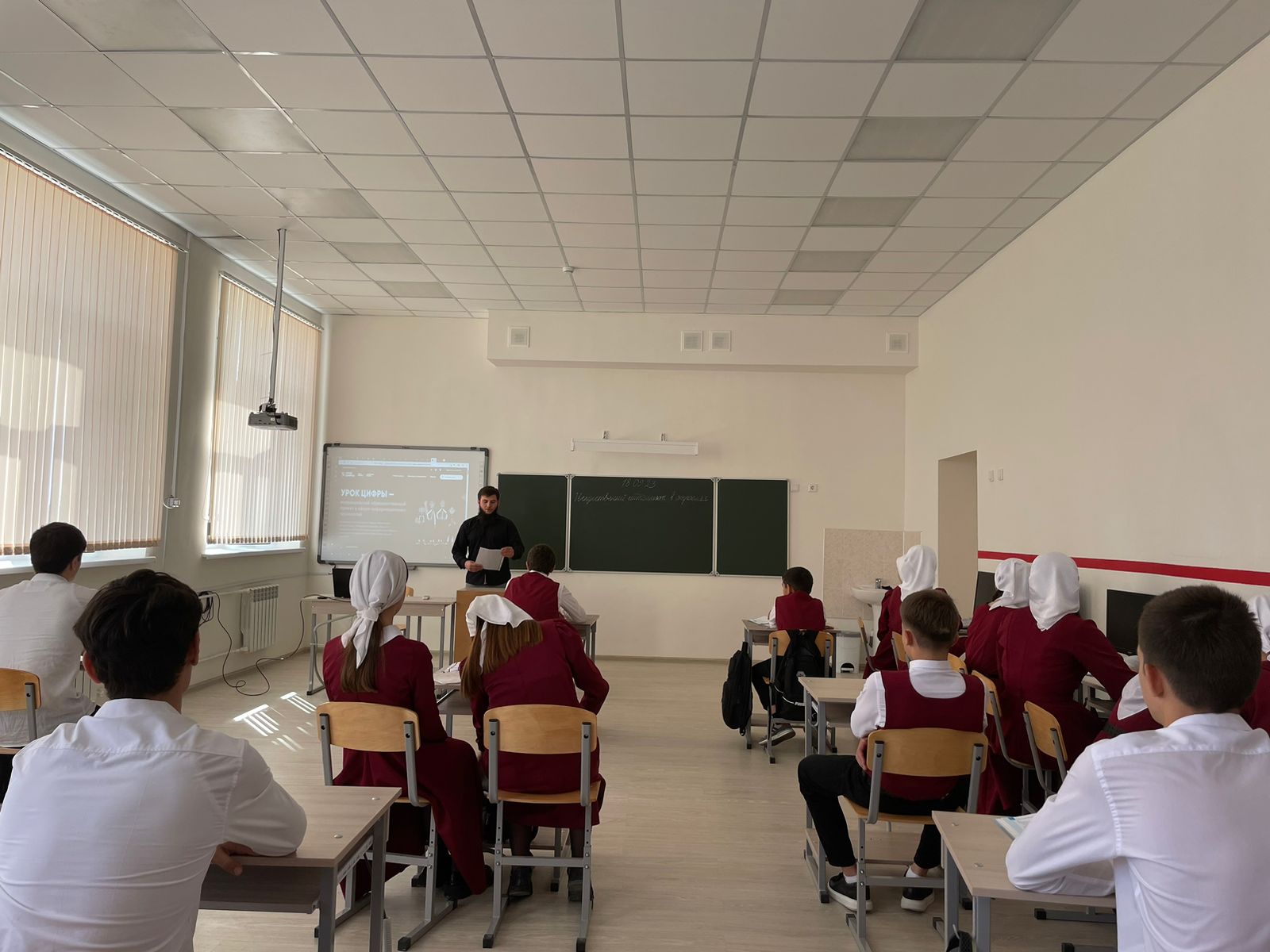 18 сентября 2023г. в МБОУ «Гимназия №10 с.п.Знаменское» были организованы и проведены уроки по теме «Искусственный интеллект в образовании» для обучающихся 8 – 9 классов, учитель Дешиев И.И. В рамках урока «Искусственный интеллект в образовании» ученики познакомились с понятием «Искусственный интеллект» и узнали о возможностях его использования в работе на примере профессии учителя. На первом этапе урока был организован просмотр видеороликов по возрастным группам, где обучающиеся ознакомились с понятием «искусственный интеллект». На втором этапе урока участники проекта выполняли интерактивные задания на сайте https://урокцифры.рф/ В конце урока обучающиеся получили сертификаты об участии в проекте «Урок цифры».