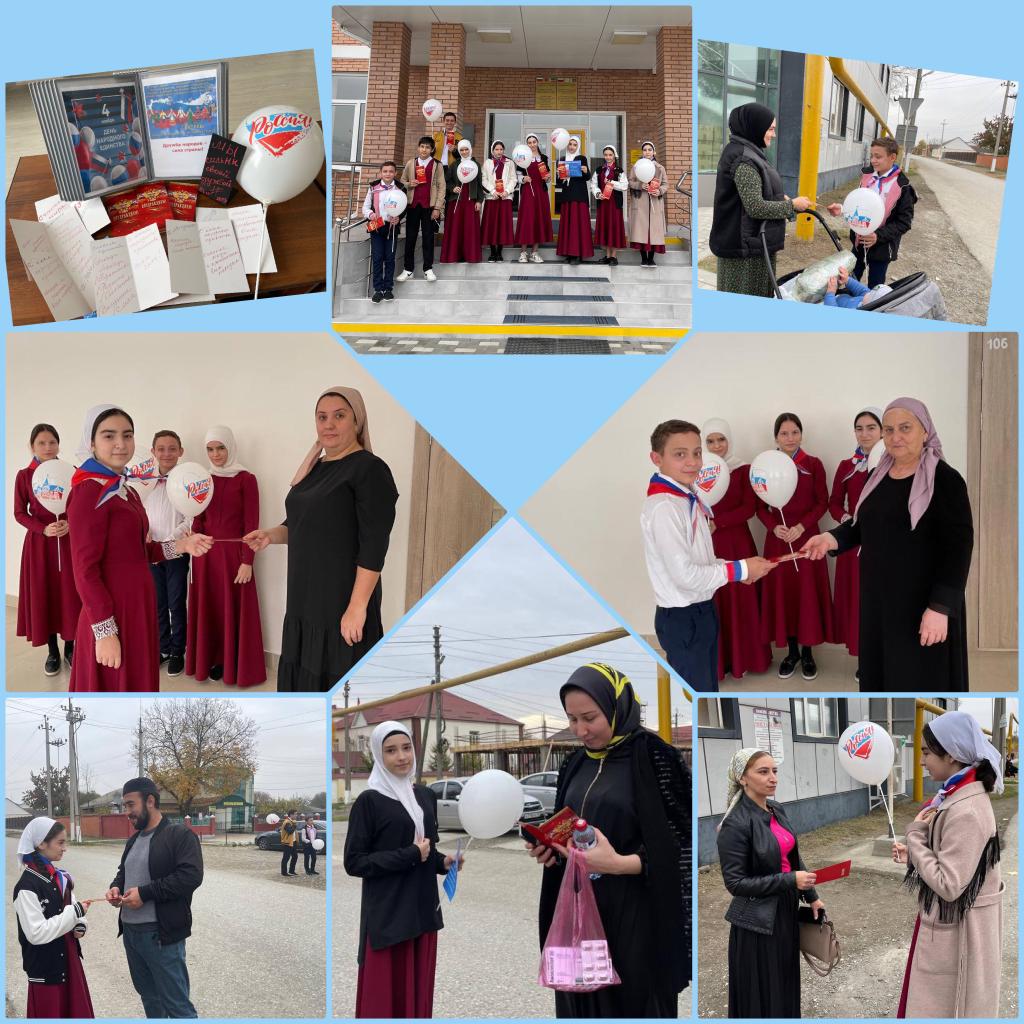 27 октября 2023 года в МБОУ «Гимназия №10 с.п. Знаменское» проведена акция, приуроченная ко Дню народного единства. День народного единства - один из самых молодых праздников нашей страны, который отмечается в соответствии с Федеральным законом «О днях воинской славы и памятных датах России». В рамках акции классные руководители рассказали ученикам о событиях Смутного времени, формируя положительную нравственную оценку таких качеств, как бескорыстие, ответственность за судьбу своей страны и своего народа. Активистами по подготовке и распространению поздравительных открыток, листовок с информацией об истории государственного праздника стали обучающиеся 8г класса. Гимназисты, поздравляя жителей села с наступающим праздником, напомнили о том, как важно жить в мире и согласии друг с другом. В завершении акции ребята проскандировали: «Сохранить весь мир нам нужно, будем жить в единстве дружно!» -Национальная идентичность и наше единство – это, в первую очередь, сохранение памяти о прошлом, а также бережное отношение к традициям, - подчеркнула заместитель директора по ВР Мальцагова М.С. Данная акция способствовала формированию чувства гордости за страну, воспитанию уважения к её истории.