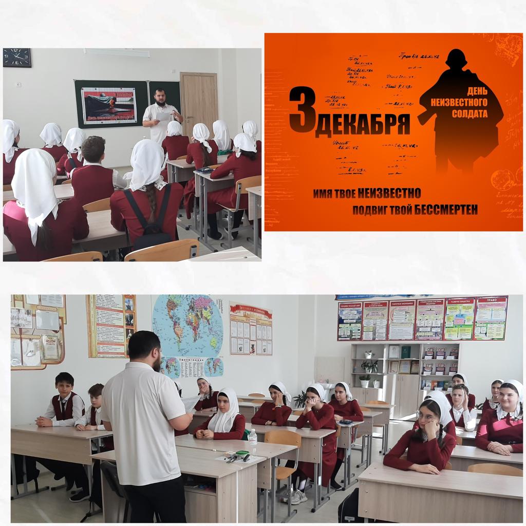 01.12.2023В 7а классе (классный руководитель Даудов И.В.) ко Дню неизвестного солдата прошел Урок Мужества «Доблесть, мужество и честь». Идрис Вахитович рассказал ребятам о Памятной дате 3 декабря, посвящённой всем воинам, чьи имена и места захоронений остались неизвестны, о том, как отмечают этот день и создают почести павшим воинам в России и по всему миру. Память о героизме тех, чьи имена остались неизвестными, увековечена у стен Московского Кремля в Александровском саду. «Эта дата служит очередным напоминанием о том, что в истории достаточно горьких уроков, которые должны учить нас больше всего на свете ценить и беречь мир, заботиться друг о друге и беречь память о подвиге старшего поколения», – отметил классный руководитель. Уроки мужества – это еще одна возможность вспомнить о Великой Победе, о героических подвигах советских солдат.