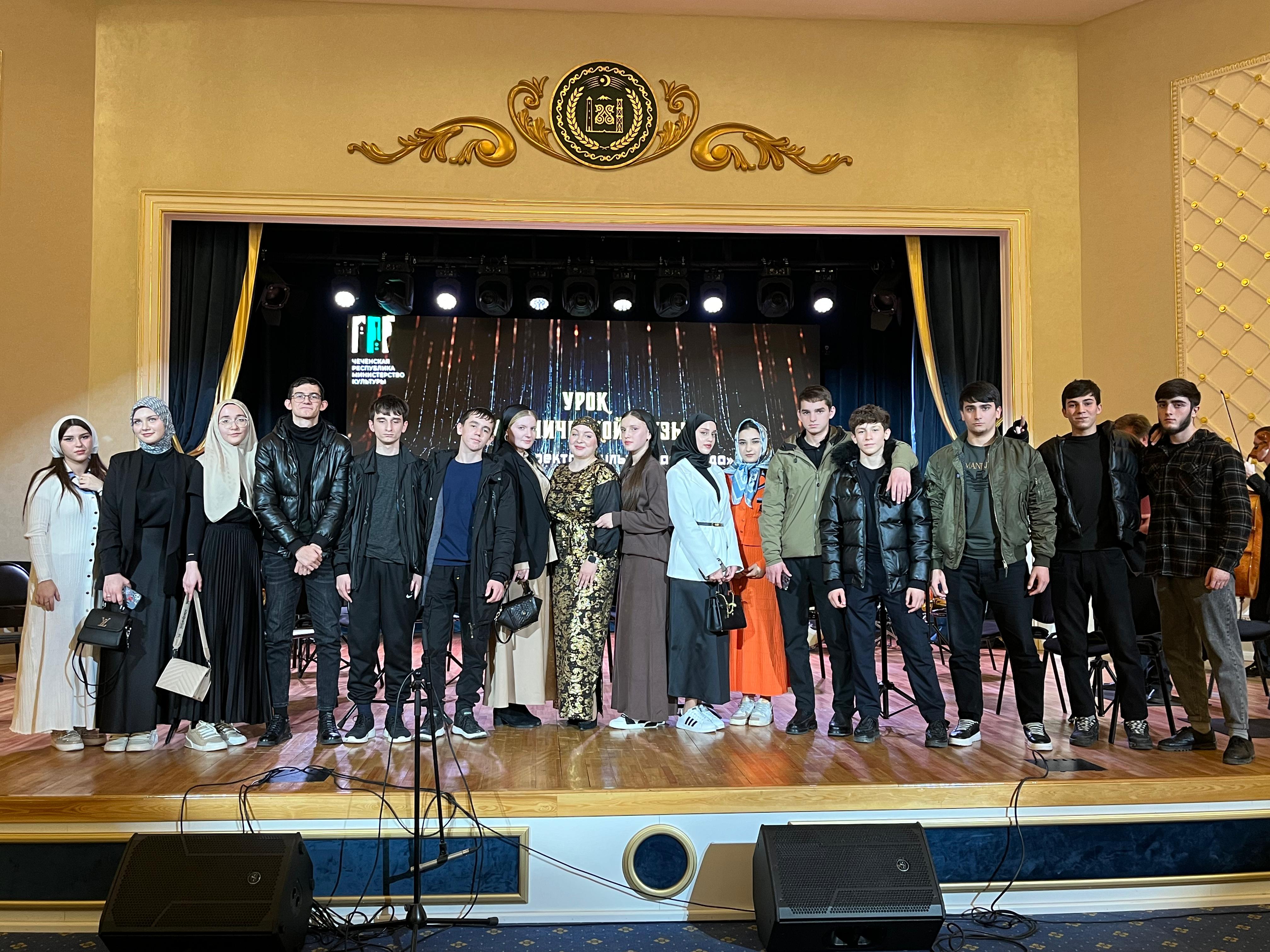 4 декабря 2024 года в рамках реализации федерального проекта «Культурная среда» обучающиеся 9в класса МБОУ «Гимназия №10 с.п. Знаменское» посетили «Урок симфонической музыки», который прошел в Чеченской Государственной филармонии им. А. Шахбулатова в г.Грозном. Девятиклассники воспользовались государственной программой «Пушкинская карта». Проект «Культурная среда» направлен на привлечение детей и молодёжи в культурную жизнь республики и развитие сферы культуры и искусства. Учащиеся с интересом слушали как симфонический оркестр Чеченской государственной филармонии им. А. Шахбулатова под руководством народного артиста России, профессора Валерия Хлебникова исполняли музыкальные произведения. После концерта наши гимназисты с восторгом обсуждали особо понравившиеся моменты концерта и планировали новые встречи с артистами филармонии. «Ребята окунулись в удивительный мир музыки. Услышали музыку великих композиторов, послушали самые интересные истории из их жизни и даже попробовали себя в качестве дирижера, - рассказала классный руководитель 9в класса Лалиева Жарадат Руслановна.