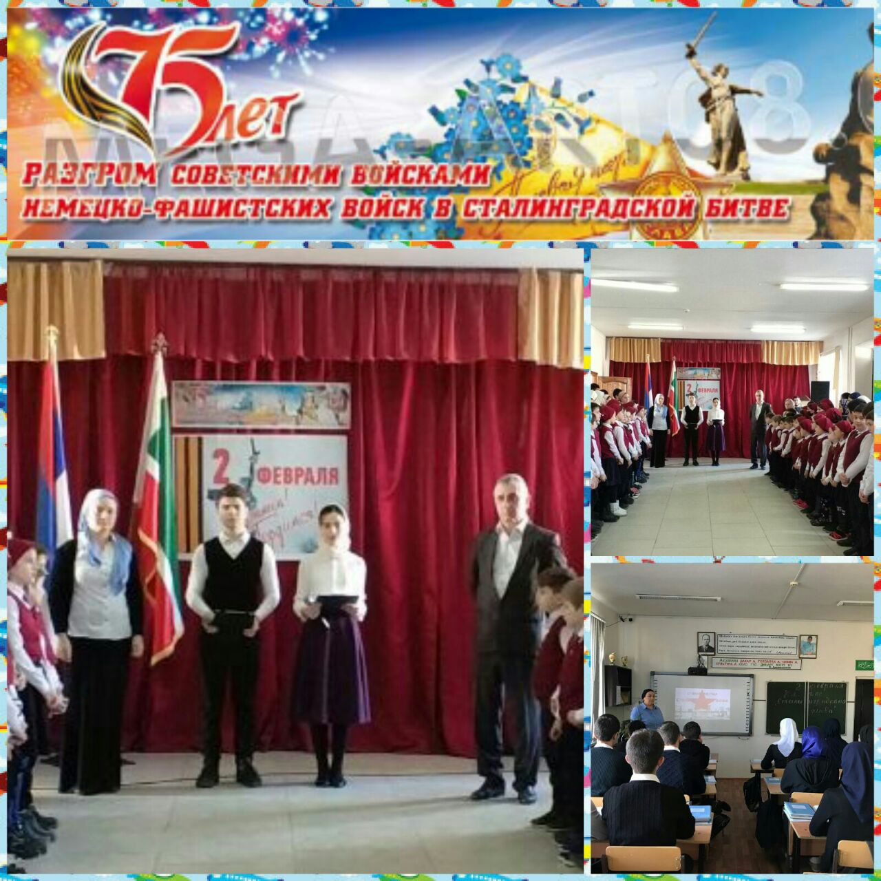 - выпуск тематической стенгазеты к 75-летию Сталинградской битвы; - музыкальные перемены «Песни военных лет»; - торжественная линейка «Помним! Гордимся!»; - уроки патриотизма в честь исторического события «200 дней и ночей Сталинграда»; - конкурс рисунков в 4-Б классе «Слава армии родной»; - викторина «Колесо истории» с обучающимися 10-х классов.