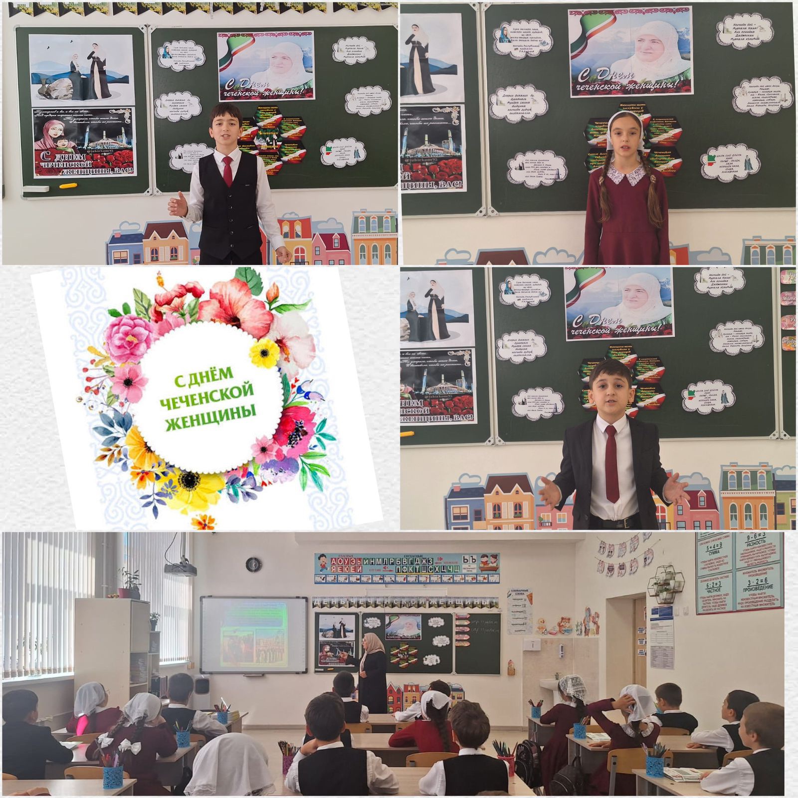 На классных часах, приуроченных к светлому празднику, наши ученики знакомились с историей праздника. Учащиеся 4в класса выразительно читали стихи, посвященные чеченской женщине, на чеченском и русском языках.