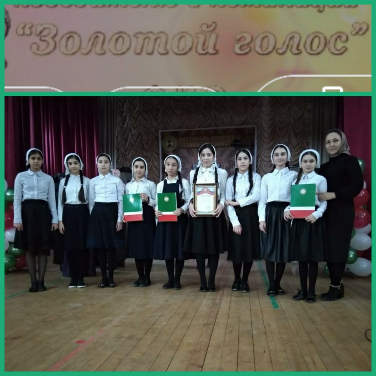 09.02.2019Вокальная группа МБОУ "Гимназия N10 с.п. Знаменское" заняла 1 место в муниципальном этапе республиканского конкурса-фестиваля "Золотой голос" в номинации "Групповое исполнение" (руководитель группы Х.С.Мальцагова) Молодцы!