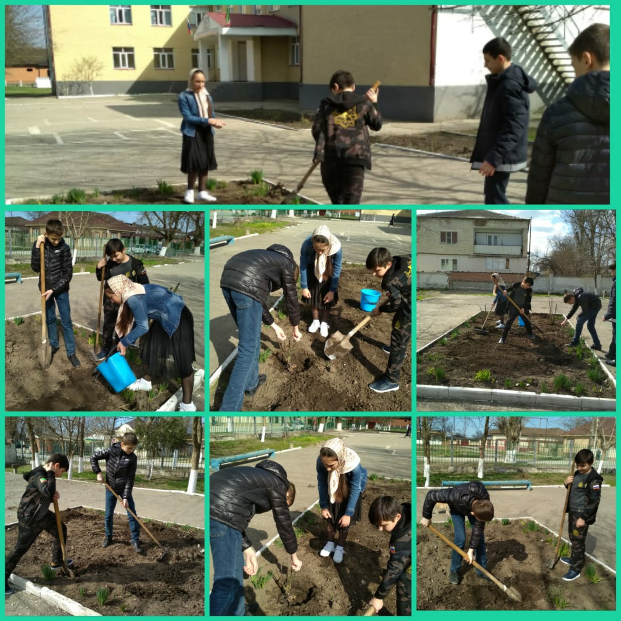 Обучающиеся 7 -Б класса на субботнике по озеленению пришкольного участка.( Кл.рук.Мамакаева Ф.А.)