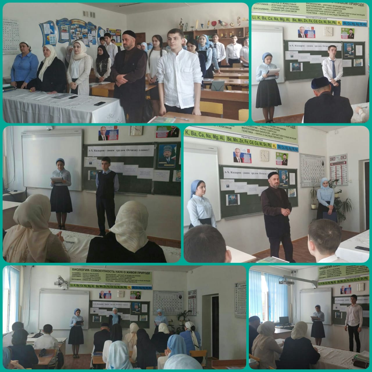 Конкурс чтецов, посвященный памяти Первого Президента ЧР, Героя России Ахмат-Хаджи Кадырова (Дала г1азот къобалдойла цуьнан). Лучшие чтецы награждены грамотами на общешкольной линейке.