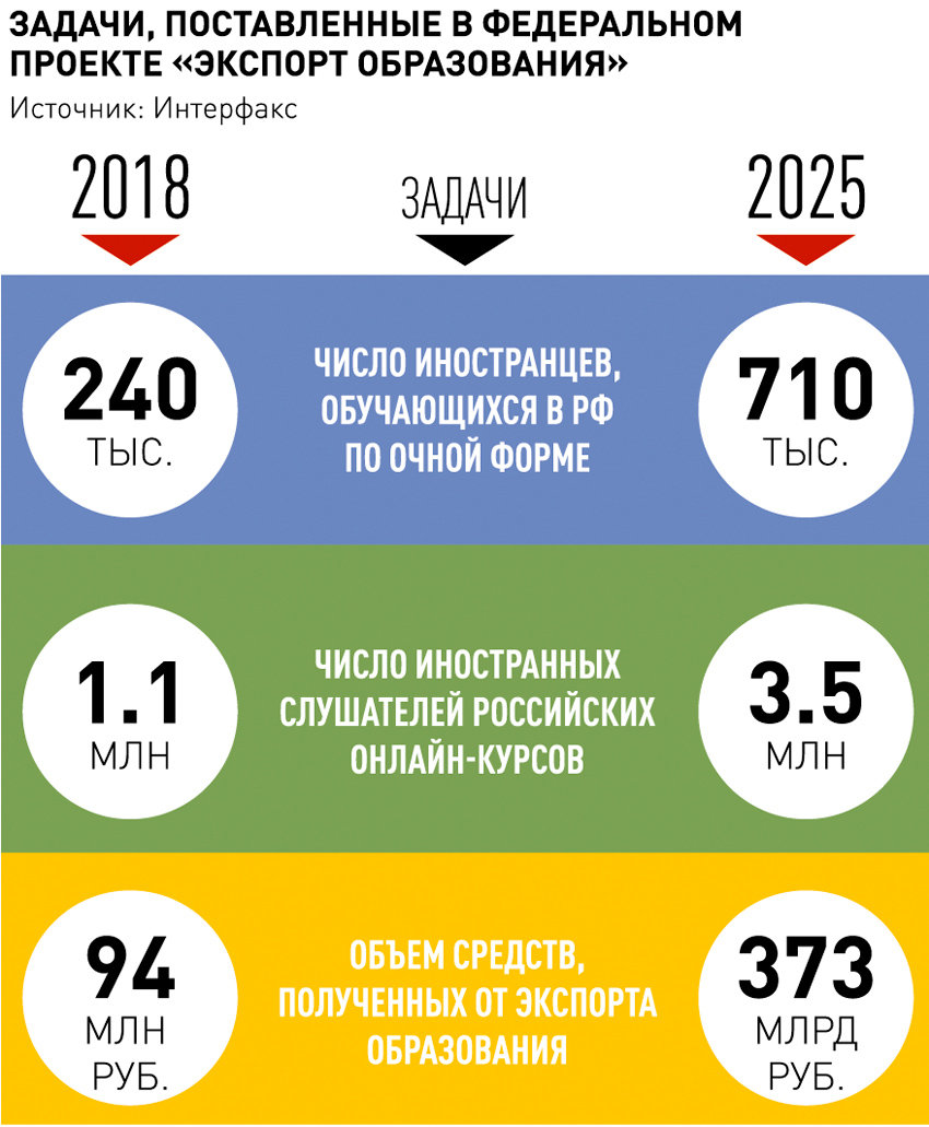 увеличение числа иностранных граждан, которые обучаются в российских вузах, до 435 тысяч человек, ежегодное обучение как минимум 15 тысяч иностранных граждан в летних и зимних школах, реализация в не менее 60 университетах минимум по 5 образовательных программ, прошедших международную аккредитацию.